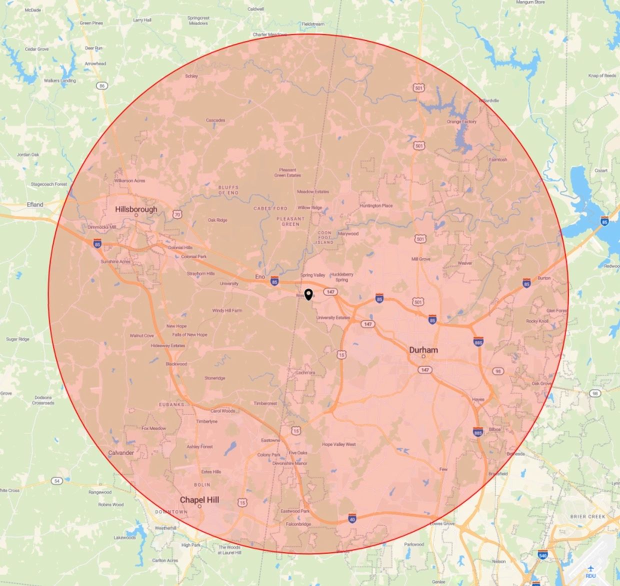 The highlighted area approximately indicates our typical service area. We may consider service requests within a short distance outside this area, in which case an addition travel time fee would be charged.